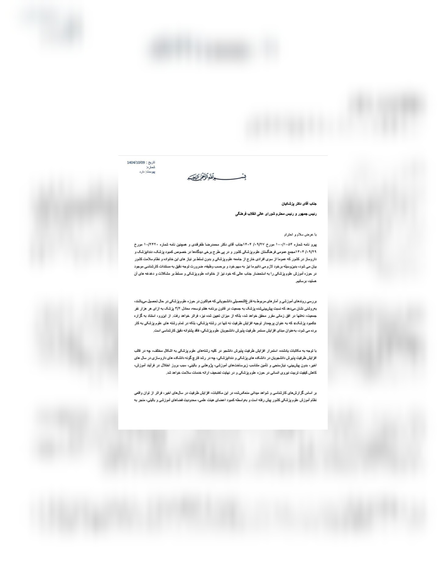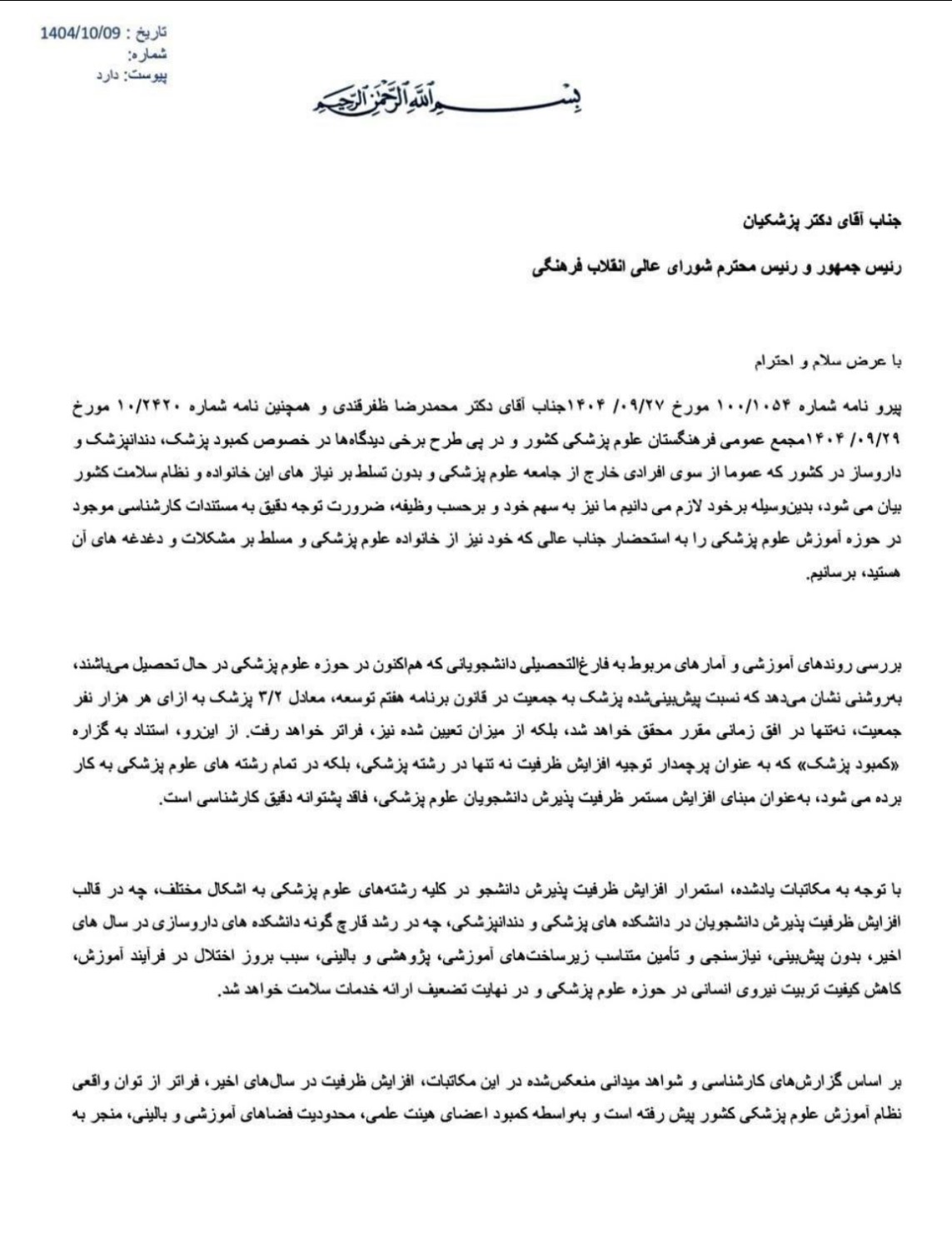 نامه بیش از ۶۰ دبیر صنفی پزشکی، دندانپزشکی و داروسازی سراسر کشور به جمعی از دبیران صنفی سراسر کشور به عنوان نمایندگان قانونی و مشروع جمع بزرگی از جامعه علومپزشکی در نامهای رسمی به ریاست محترم جمهور، دکتر پزشکیان ، نسبت به افزایش بیرویه ظرفیت پذیرش در تمام رشتههای علوم پزشکی هشدار دادند و تأکید کردند که نسبت پیشبینیشده پزشک به جمعیت در قانون برنامه هفتم توسعه نه تنها محقق میشود، بلکه از حد تعیینشده نیز فراتر خواهد رفت. بنابراین استناد به ادعای «کمبود» برای توجیه افزایش ظرفیت، غیرکارشناسی و نادرست است.