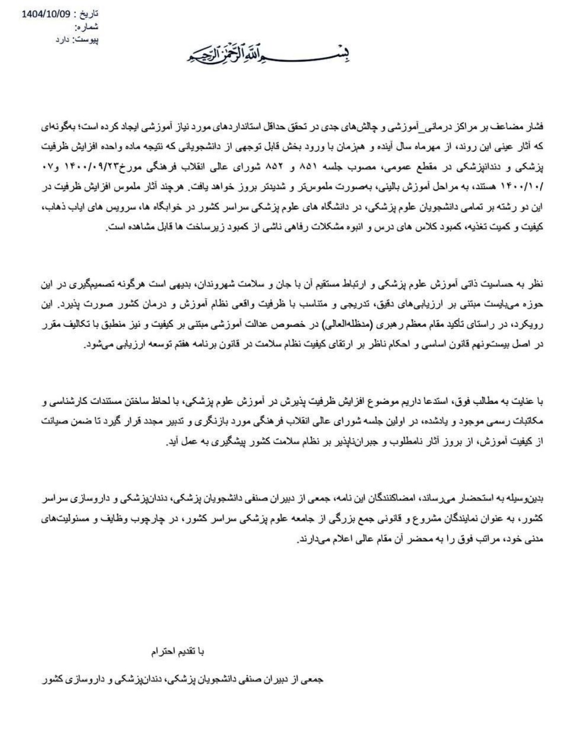 نامه بیش از ۶۰ دبیر صنفی پزشکی، دندانپزشکی و داروسازی سراسر کشور به جمعی از دبیران صنفی سراسر کشور به عنوان نمایندگان قانونی و مشروع جمع بزرگی از جامعه علومپزشکی در نامهای رسمی به ریاست محترم جمهور، دکتر پزشکیان ، نسبت به افزایش بیرویه ظرفیت پذیرش در تمام رشتههای علوم پزشکی هشدار دادند و تأکید کردند که نسبت پیشبینیشده پزشک به جمعیت در قانون برنامه هفتم توسعه نه تنها محقق میشود، بلکه از حد تعیینشده نیز فراتر خواهد رفت. بنابراین استناد به ادعای «کمبود» برای توجیه افزایش ظرفیت، غیرکارشناسی و نادرست است.